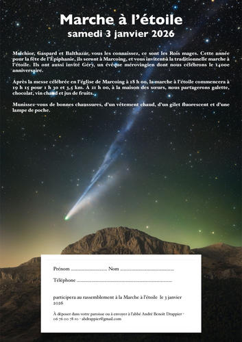 Après la messe célébrée en l’église de Marcoing à 18 h 00, la marche à l’étoile commencera à 19 h 15 pour 1 h 30 et 3,5 km.